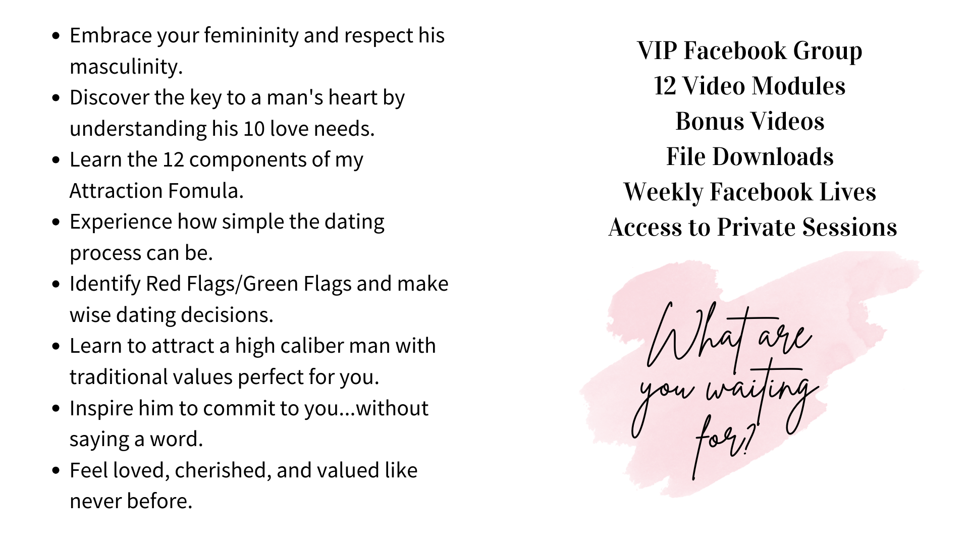 I do not do dating coaching with men. However, I will be creating course content for men to purchase in the future!